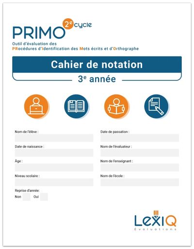 Le PRIMO-2e cycle est un test normalisé auprès de 138 élèves québécois francophones fréquentant des classes de 3e et 4e année du primaire et validé auprès d’un groupe d’élèves dyslexiques/dysorthographiques. Il est constitué de huit tâches de lecture et d’orthographe qui permettent de :